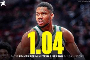 此役过后,雄鹿当家球星扬尼斯·阿德托昆博本赛季场均得分上涨至33.8分,场均出场时间为32.3分钟,他上场每分钟能得到1.04分,追平了NBA历史记录!