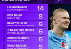1、埃尔林-哈兰德,曼城,14球