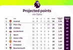 英超官方发布了一项趣味榜单,内容为每支球队按照如今的效率,赛季末可以拿到多少个积分。