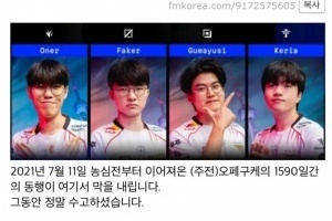 体育资讯11月17日讯 今日T1官宣Gumayusi正式离队,而韩网有网友发帖自从2021年7月11号开始,OFGK组合已经一起走过了1590天。