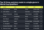 日前,李贤重在对阵中国男篮的比赛中砍下33分,带领球队在中国队的主场赢得世预赛第1场胜利。全场比赛他投中9记三分球,打破了世界杯资格赛阶段单场三分球最高纪录,成为历史第1人。
