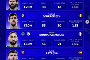 体育资讯12月2日讯 《转会市场》评选2025年最佳门将,并列出了4人候选同时对比了他们的数据:
