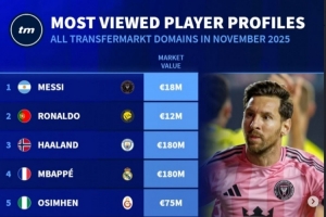 体育资讯12月3日讯 德转列出了11月份球员页面浏览量排名,前三依次为梅西、C罗、哈兰德。