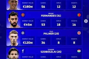 B费(曼联,31岁,葡萄牙):身价4500万欧,53场,18球,16助攻
