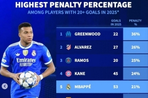 2025进球20+球员点球占比榜:青木居首 凯恩、姆巴佩、哈兰德在列