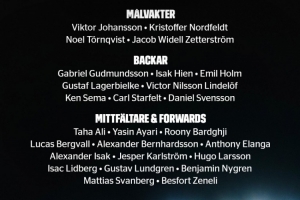 门将:维克托-约翰松(斯托克城)、诺德菲尔特(AIK索尔纳)、托恩奎斯特(米亚尔比AIF)、泽特斯特罗姆(德比郡)