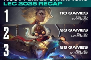 体育资讯12月6日讯 LEC2025赛季回顾:选用最多次数的英雄芮尔&被禁最多次数的英雄大树。