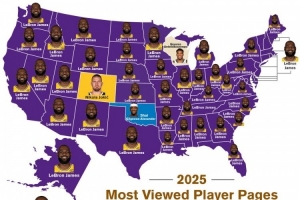 BBR2025年美国各州被浏览次数最多的NBA球员:詹姆斯霸榜47个州