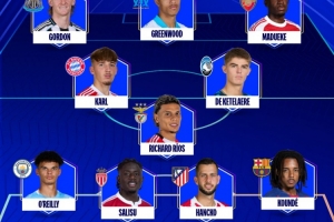 欧冠本轮最佳阵:马杜埃凯、格林伍德、奥赖利、孔德、卡尔入选