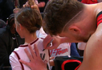 赛后,申京为场边的小球迷送上签名。