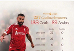 利物浦官方盘点萨拉赫自加盟以来各赛季英超参与进球数: